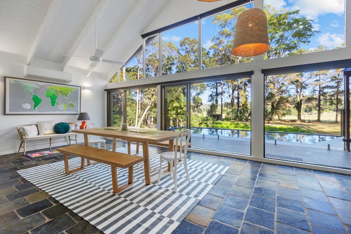 The layout is open-plan and light filled with an expansive living and dining area , complete with a 55 inch Samsung TV and Sony soundbar, all set under a beautifully pitched and beamed 11 metre ceiling. A soaring wall of glass (with remote controlled blinds) stretches 6 metres high framing views of the neighbouring nature reserve where you can watch kangaroos and local wildlife idle by. A separate reading den provides another break-out area for those wanting some down time.