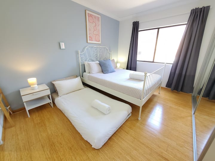 Our apartment is a modern and large 103sqm apartment which is located on the first floor (up one flight of stairs). Space includes: two large bedrooms with built-in robes, master bedroom with modern ensuite, bright open plan living/dining, gas kitchen with all cookware provided, cutlery, crockery, large fridge/freezer, microwave, toaster, kettle, Nespresso machine, dishwasher, large sofa, Wi-Fi, 55" 4K Smart TV, mini office, laundry room with washing machine and dryer, and massive private balcony with BBQ and outdoor lounge. Wooden floor boards in bedrooms and tiles throughout the apartment. Perfect for families with children.