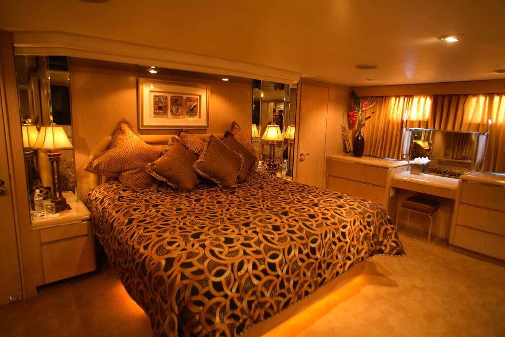 Amenities include a master stateroom with a king size bed, a guest room with a double size bed and a third cabin with two twin beds. Each room has its own bathroom with the master bathroom recently renovated to include new interior and a steam shower.