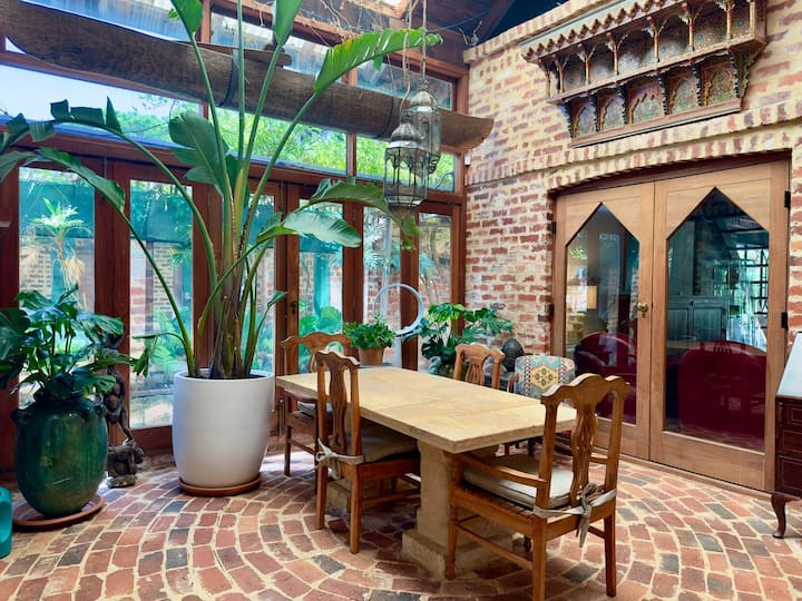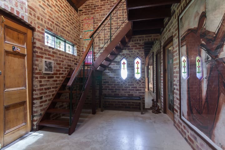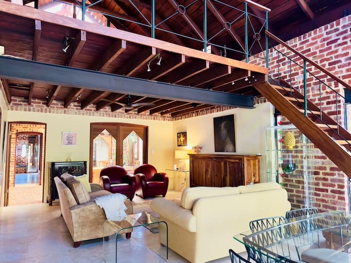 This stunning two-storey loft home is designed by acclaimed architect Brian Klopper, featuring Italian marmorino walls, vintage recycled bricks, exposed iron-work, lots of timber, travertine floors in living areas and bathrooms, stained glass windows, all surrounded by greenery in a quiet, leafy street.