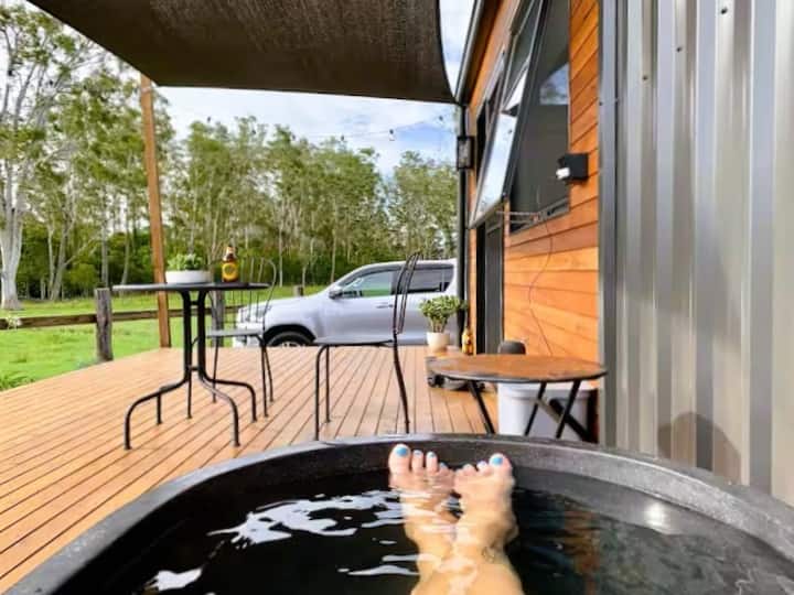 The tiny house is located in the middle of a paddock, fenced to keep the livestock out and tucked away to enjoy privacy and a birds eye view of the surrounds.