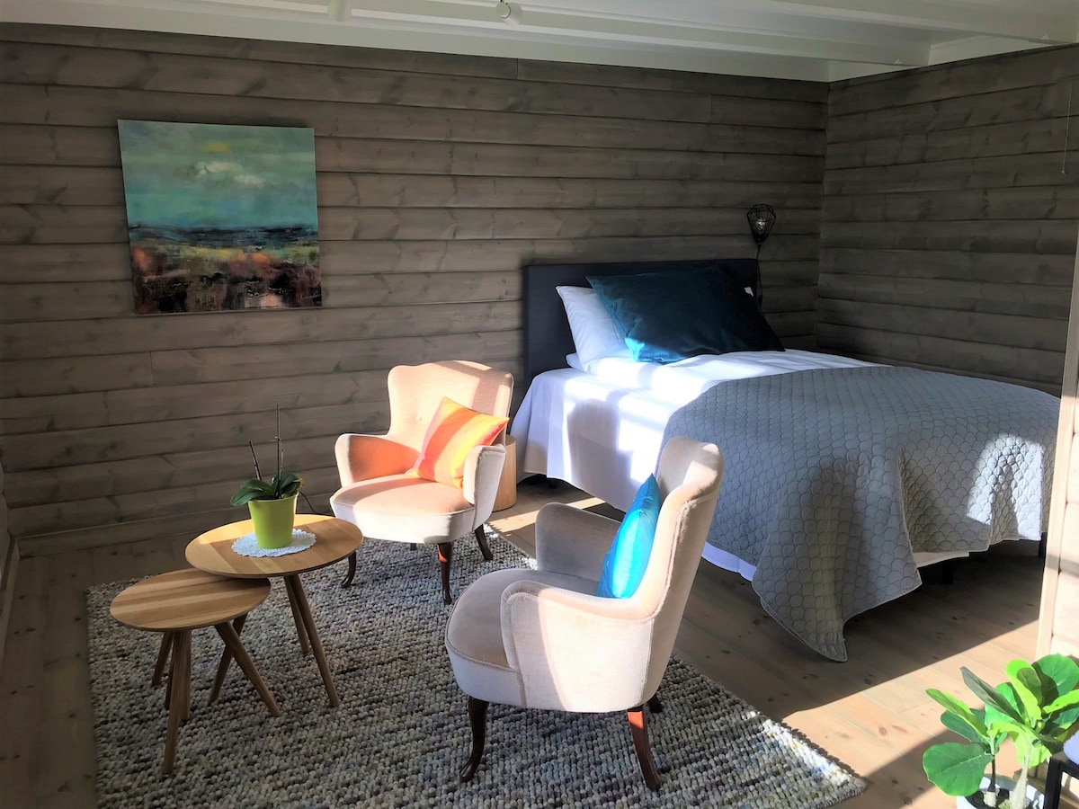 The flat comprises the entire ground floor of a small farmhouse and has a main bedroom with ensuite, a sitting room (functions as a second bedroom when there are more than two guests), a kitchen and a second bathroom. The surroundings are peaceful and you can park right outside the door. At certain times of year, you might see elk or cranes. In the summer, cows graze in the nearby fields; the traditional barn is now a cultural centre, run by Fjøsakademiet.