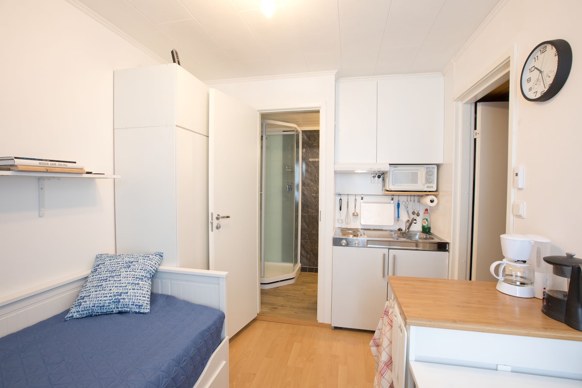 Captains Cabin is a separate part of my house. Made for 2 person, but 4 can sleep in 2 doubble beds. 2 room. own entre. own bathroom, showercabin and wc. Mini kitchen. Free parking with electric for car heater. acces to garden with fireplace living room 10,7 m2 Bed room 7,6 m2 Bathroom 3,3 m2 Total area 21,6 m2 It is located 3 km from city center, close to bus stop for local bus. I speak only English and Swedish.