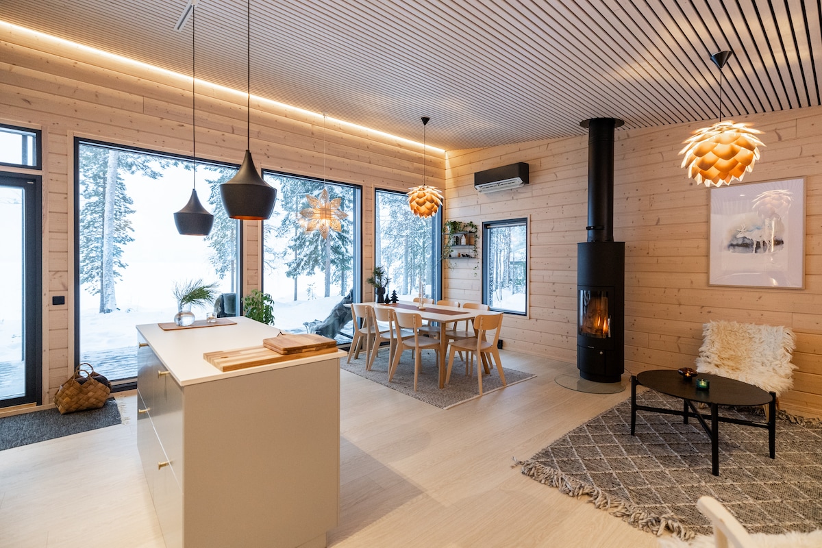 Enjoy Lapland's nature and lovely sauna in privacy. Accommodation and experiences in same place. Modern cottage (2023, 48m²). Two frame mattress beds and two extra beds from bedsofa, also good for adults. All the beds in same space. See the wonderful landscape and northern lights from frozen lake or through large windows. Outdoor sauna is heated once during the visit. Swimming hole in ice and fireplace outside in use. Find us ig: @scandinavian.lakesidecottage
