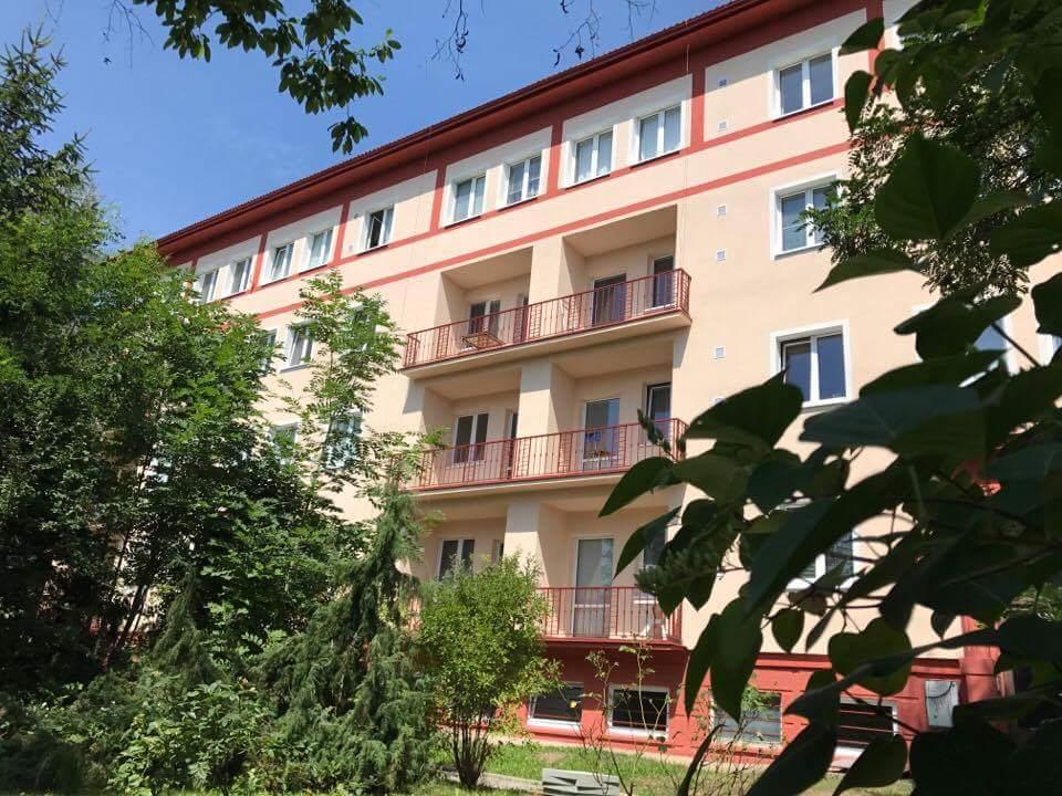 If you are traveling by yourself then this apartment is just what you’re looking for. It is a compact, yet comfy, bright one-bedroom apartment with wooden furniture and a French window. The apartment has a storage unit, a big TV on the wall, and a fully equipped kitchen. (The kitchen is shared with 3 other apartments). The design of the bathroom is minimalistic but underlined with warm colors and large tiles. You can also spend time on the balcony which is a part of the shared spaces.