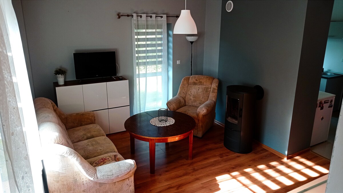 A separate apartment in a single-family house in a quiet area with a large yard. The A1 highway is about 15 km away. Free parking is available for guests with the possibility of parking under the shelter. The apartment includes a living room with a fireplace, a kitchenette with equipment, a bathroom with a shower, a hair dryer, an iron and an ironing board. The bedroom has a comfortable 180x200 cm bed (+ a folding bed as an extra bed in the living room). Sandy the bitch lives in the host's house.