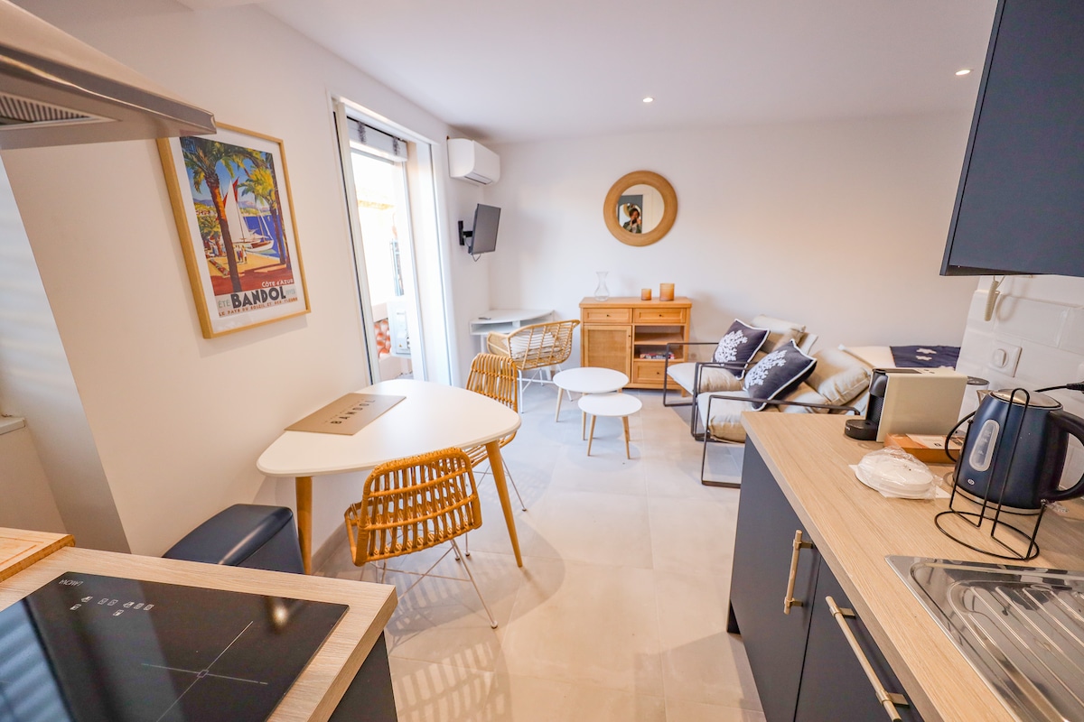 ☀︎ 42 m2 2-room apartment, completely refurbished, air-conditioned with beautiful terrace located in the city center of Bandol. 1st floor of a fully renovated village house. ☀︎ South-facing, sunny. Furnished with every comfort, bultex bedding. Double vanity in the bathroom. Terrace with deckchair, parasol! ☀︎ Port, shops, restaurant, bar, beaches 50 m from the apartment. ☀︎ Ideal location for walking, the charm of a Provençal village. Parking nearby. Visit our page ☀︎ Instagram @thisisbandol