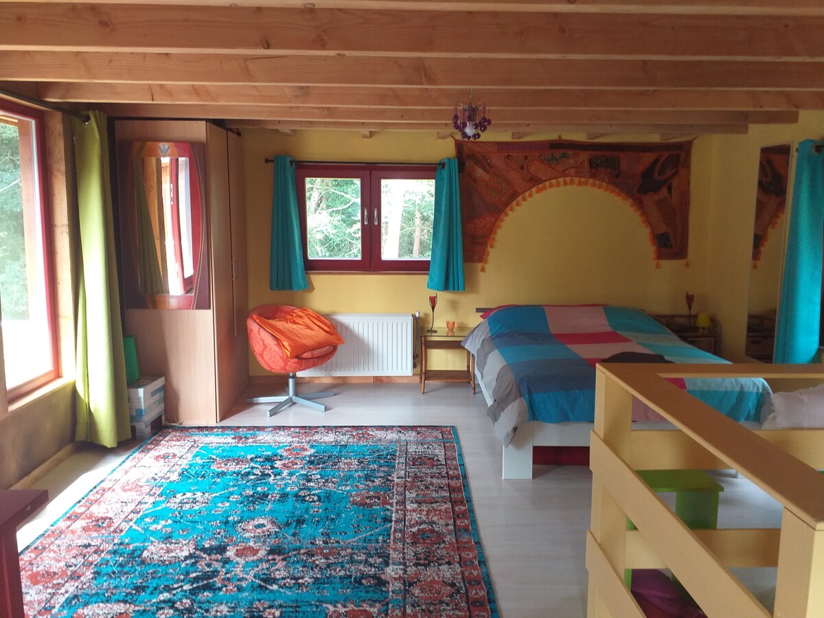 *Max. 2 adults - there are 4 sleeping places (2 for children, steep stairs! Please read the description before booking). Additional price for 4p is €30 per night* Are you looking for a cozy place, in the middle of an exuberant vegetable garden full of flowers? Be welcome. The garden house is in the middle of our 2000 m2 garden. At the edge of the garden, you will find the sauna and hot tub overlooking the meadows. We live here a large part of the garden, and like to share the richness of the outdoors with others.
