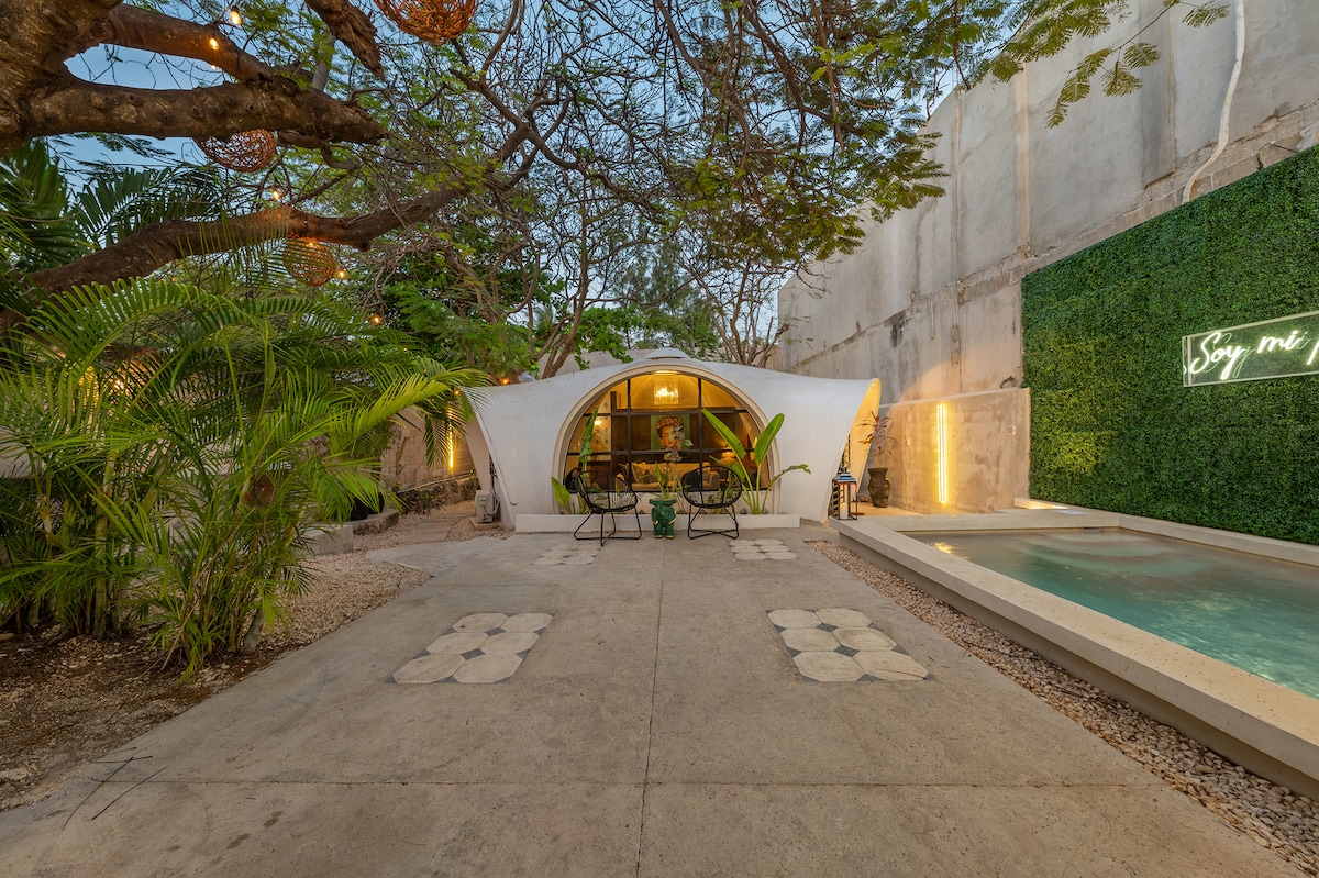 Beautiful luxury house with Mayan and hardwood style. A authentic Prehispanic experience. The suite has a equipped kitchen , bathroom, bedroom with smart TV ,and closet, private terrace and garden and a large shared pool chlorine free. Hermosa suite de lujo con acabados en maderas preciosas y estilo Maya. Una autentica experiencia mexicanca estilo prehispanico. Cuenta con cocina equipada,baño completo,recamara con Smart TV y closet,terraza y jardin privados y gran alberca sin cloro , compartida