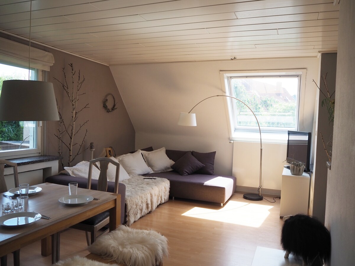 📍4 km HAJ ✈️ 📍300 m to the bus stop 🚌 📍1 km to S-Bahn station, 9 min to Hannover main station, 30 min to fairgrounds🚆 📍 Directly on the A2 🛣 🖥 Smart TV & PlayStation 4 Cozy attic apartment with spacious living and dining area and an open, fully equipped kitchen. The skylights provide plenty of daylight and can be darkened. The bathroom with the large rain shower offers a wellness factor. An electric charging station is available. Looking forward to seeing you soon!