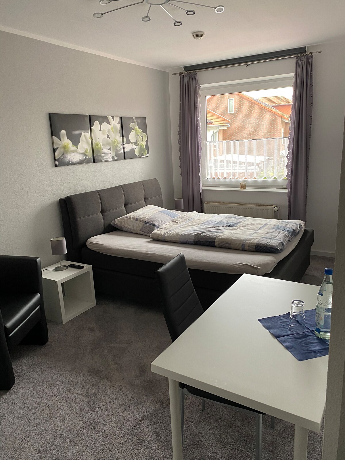 In the extension of our house, which was formerly used as a practice, this studio is available for your exclusive, private use. Next to a small hallway with a shoe cabinet and wardrobe is the small bathroom with toilet and shower. In the large, bright living room there is a small kitchenette (but NOT a fully equipped kitchen) with a sink. A foldable sofa can accommodate a third person. Behind a medium-high partition is the double bed directly at the large window.