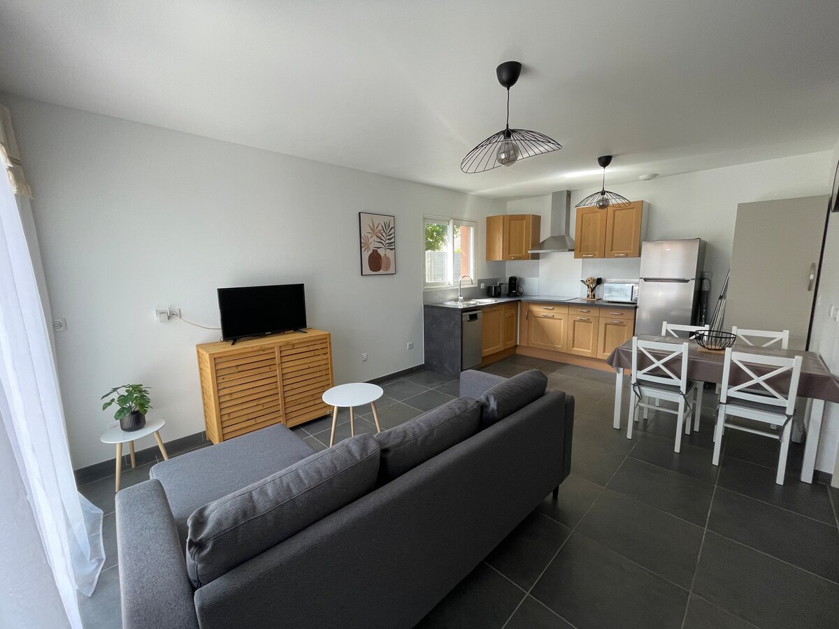 Refurbished space, 35 m2: - large bedroom / living area - separate adjoining equipped kitchen - shower room + toilet Quiet residential house, near the city center, supermarket. Your space is on the ground floor, we live upstairs. The room opens onto a large terrace at your disposal for sunny days. Coffee, tea, and infusions available. Wi-Fi connection NON-SMOKING – please go to the terrace. We will be happy to advise you during your stay!