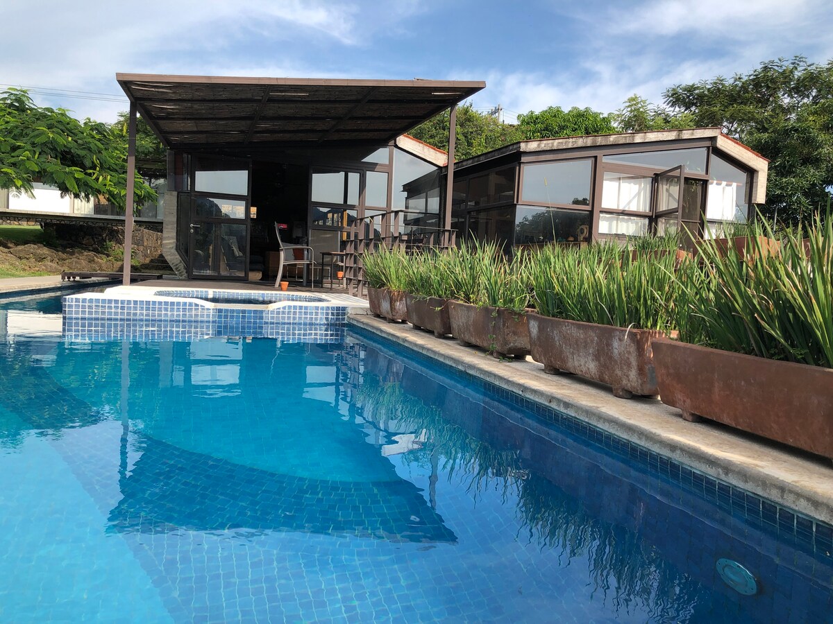 A house to rest in Vergeles de Oaxtepec. Ideal for a weekend getaway. It has one of the only biological pools in Mexico (18 meters long), without chemicals and with natural plants. Enjoy the spectacular sunsets of Morelos. The house is spacious with an innovative design of open spaces, the bedrooms have their required privacy. The subdivision is guarded 24/7, 10 minutes from downtown Tlayacapan, Oaxtepec and the water park, Six Flags. Pet Friendly