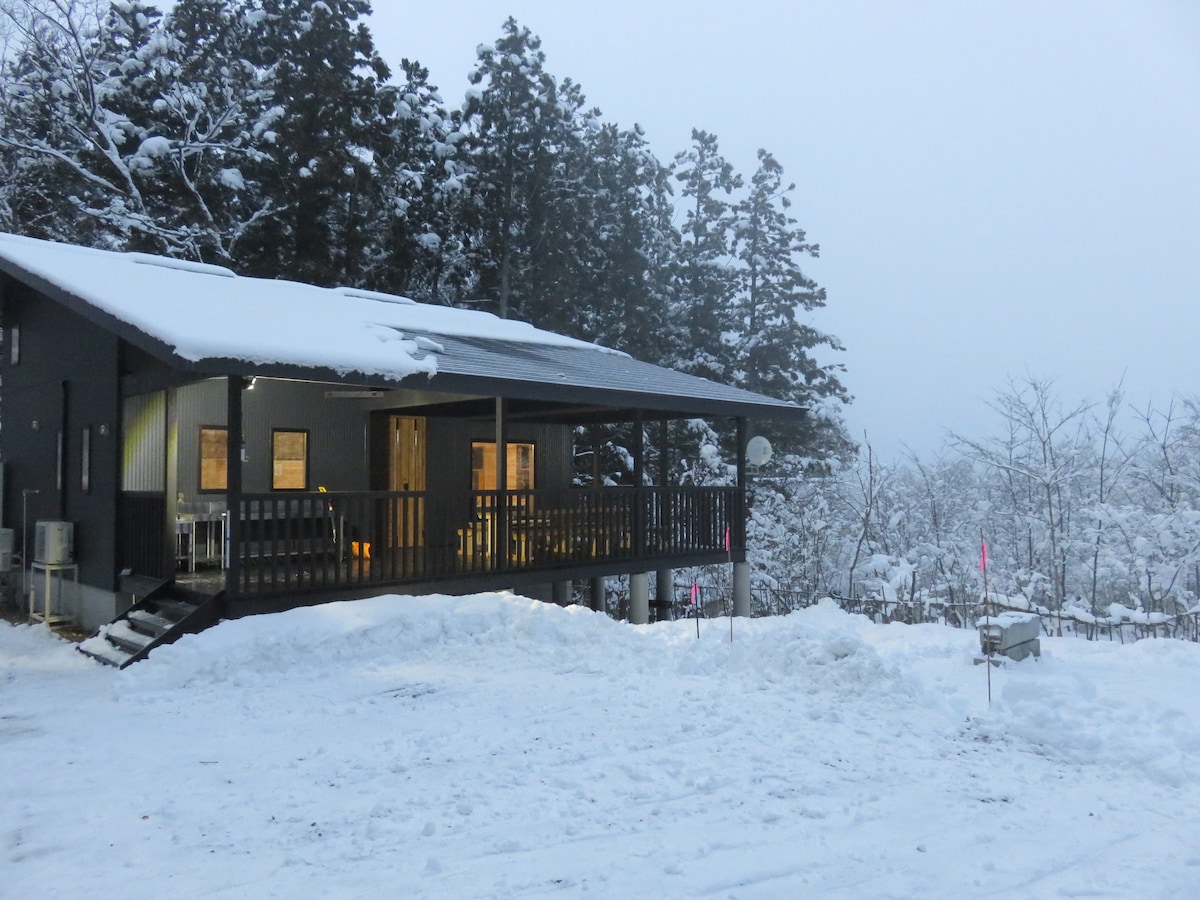 This is a new cottage built in 2022. Entering the chic house with black exterior walls, the stone hallway leading to the high ceiling living room will make you forget your everyday life. The outdoor bath is surrounded by trees, and in winter you can enjoy a relaxing snow view bath. Enjoy private theater in the living room and bedroom with a 100-inch projector screen. Displays and desks are also available for your workspace.