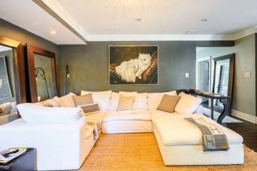 A spacious living area is furnished with a dark leather sectional sofa and a circular area rug featuring a pattern of orange and brown circles. A flat-screen TV is positioned on a stand, while light fixtures illuminate the room's neutral walls and decorative artwork.