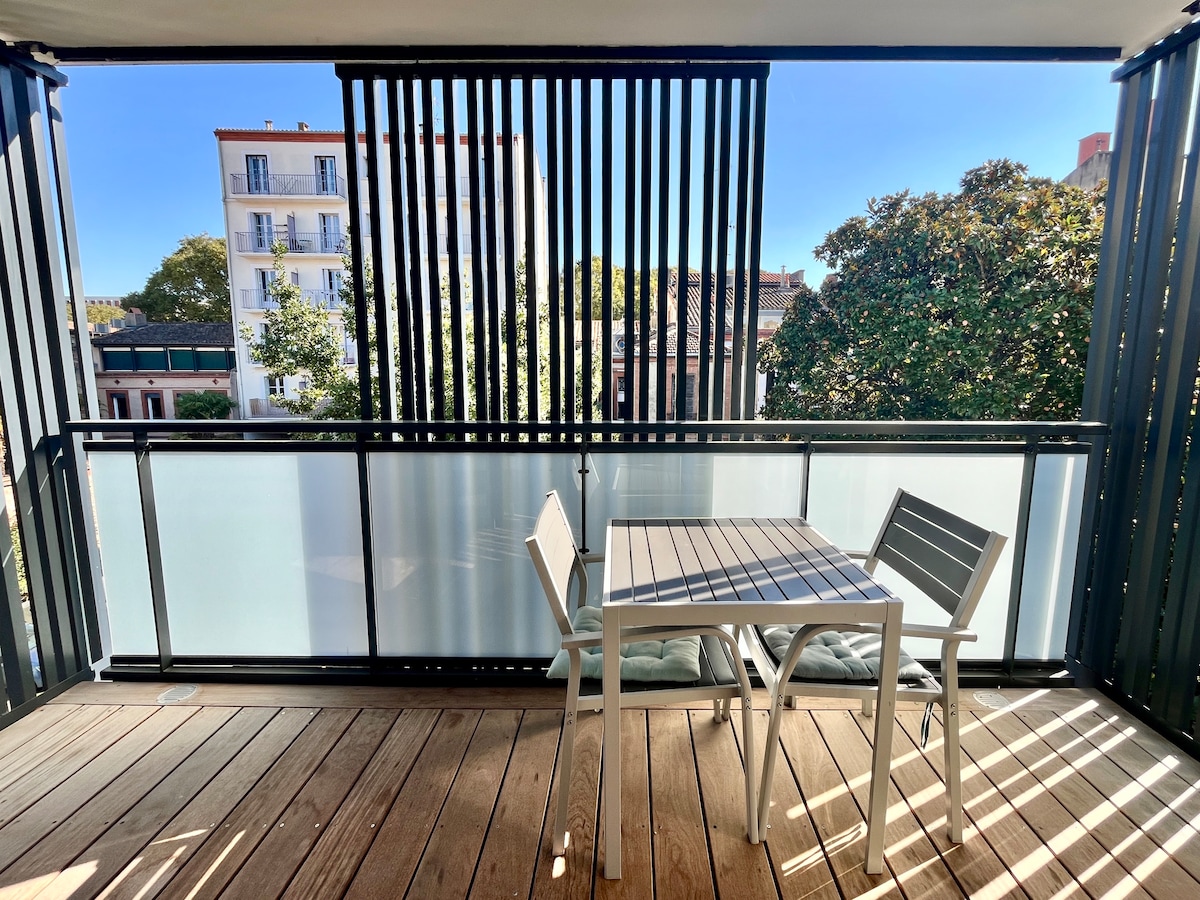 Beautiful 2-room apartment located in the heart of Toulouse, a few minutes' walk from Place du Capitole, Canal du Midi, Matabiau train station and metro. It is fully furnished and equipped for a comfortable stay, with a bedroom, living room, fully equipped kitchen and beautiful bathroom. In addition, it benefits from a private covered terrace, perfect for enjoying in any season.