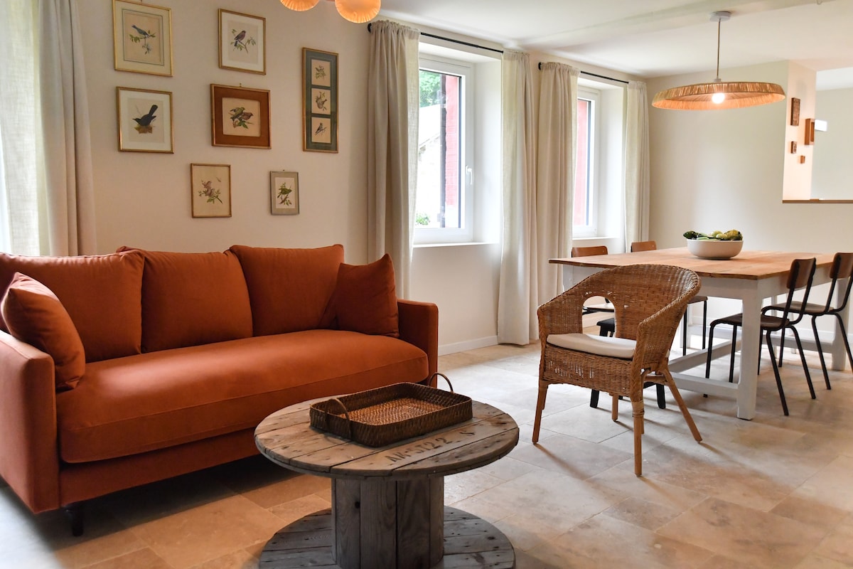 Enjoy a stylish experience at this centrally-located place. Village house: 1 living room with fireplace (wood provided), fully equipped kitchen (dishwasher, microwave, kettle, toaster etc...), sunny patio, 1 bedroom 160 x 200 bed, 1 bedroom 2 90 x 200 beds (baby cot possible/baby chair), bathroom (bathtub), separate toilet, Wi-Fi, office area and children's area. This accommodation has just been completely renovated. Very quiet. Lots of activities nearby (equestrian, hiking, cycling, various shops).