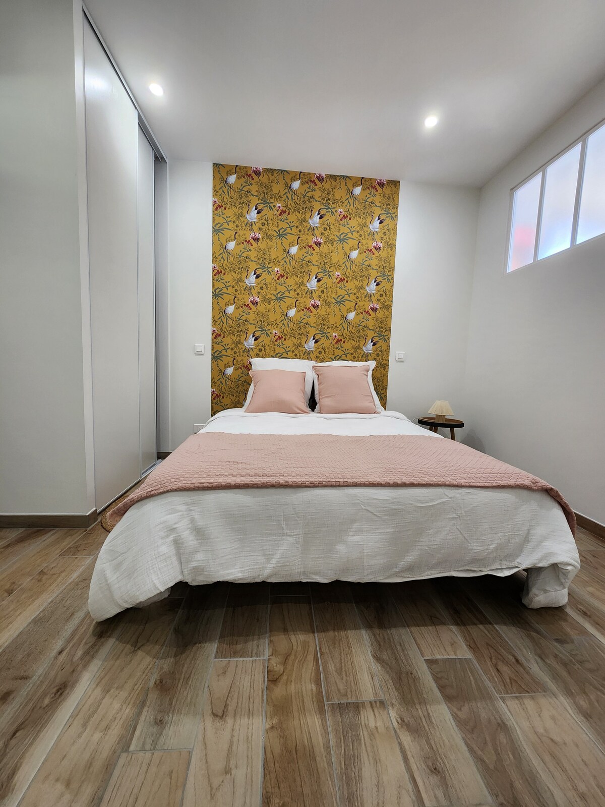 Refurbished 47 m2 apartment on the 1st floor (elevator), with an underground parking space. - A bedroom with a dressing area and desk area. - Large living room with dining area (large table + 4 chairs) and a sitting area with sofa bed. - Open kitchen (fridge/freezer, dishwasher, oven, microwave, induction stove, range hood, coffee maker, kettle, toaster). - Bathroom with shower, double sink, washing machine, hair dryer. - Separate toilet.