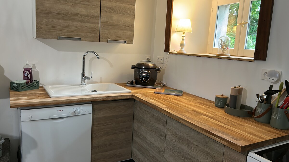 Completely renovated 90 m2 house in Benoîtville, 12 min from Flamanville and 22 min from the Orano factory. 2 bedrooms (2 beds 160 cm Bultex mattress and 1 bunk bed) and a bathroom with spacious shower upstairs. Large living room with fully equipped open kitchen (dishwasher, oven, large smart TV etc...) Laundry room with washing machine and dryer. Sunny outdoor space and parking space. Water, electricity and internet included.