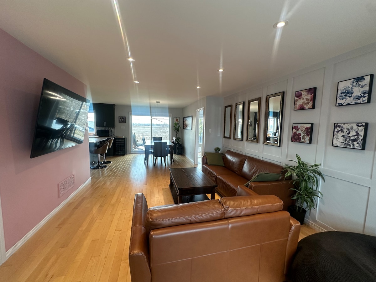 Logement spacieux, confortable et entièrement équipé au cœur de tout. Profitez de la climatisation/chauffage central, internet haute vitesse, 2 téléviseurs 4K avec IPTV, espace de travail, laveuse-sécheuse à l’étage, terrasse meublée avec BBQ, cour arrière et 2 stationnements privés. Situé dans un quartier résidentiel paisible, idéal pour un séjour relaxant ou en télétravail.