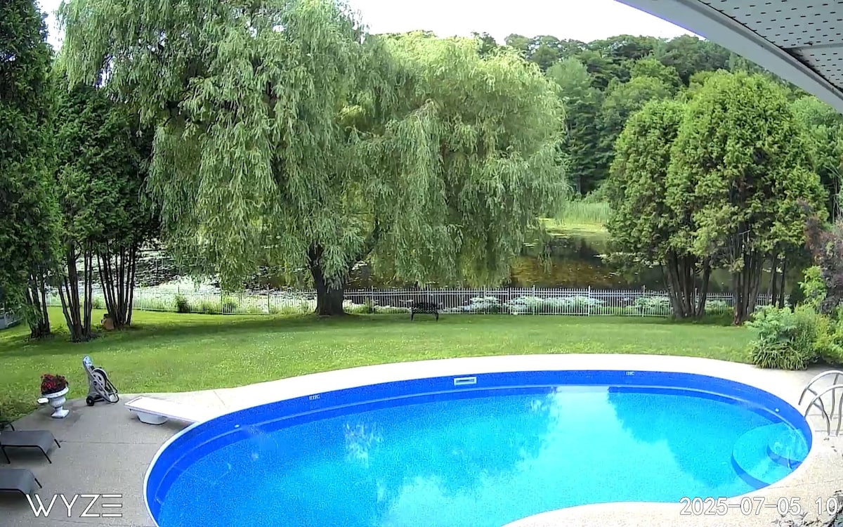 A spacious and unique space in a luxurious modern home, minutes from Montreal. Peaceful Neighborhood close to water front and to the tourist city of St. Anne de Bellevue. Nearby attractions include Parc Historique de la Pointe-du-Moulin (5 min) and Quinn Farm (5 min) Walking tracks and hiking trails close to the property. Beautiful pool , patio , and barbeque available for guests. Fully equipped Yoga room.