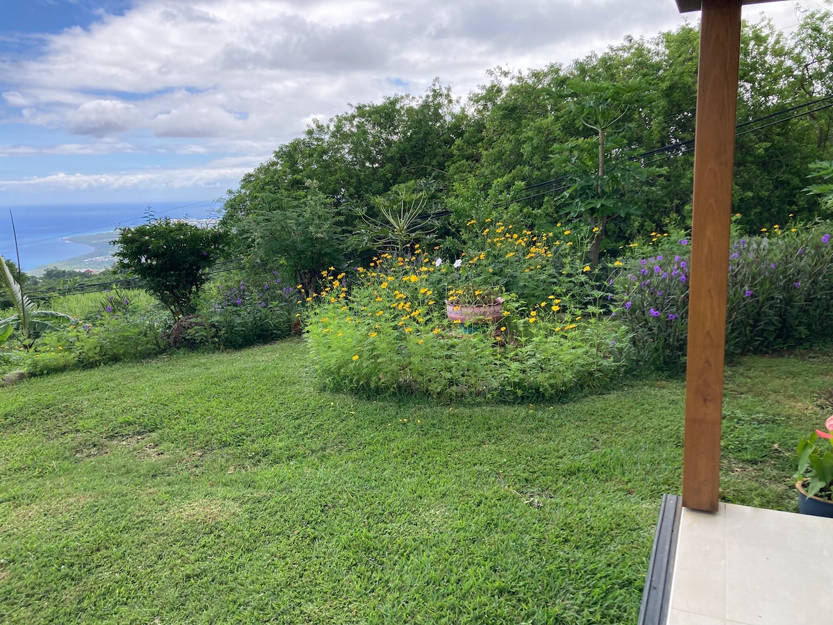 Studio with separate entrance, fully equipped for 2 people, homestay, with terrace and garden, in a all wood house. Bed for 2 + sofa, kitchen, bathroom, well stocked library with guides, books and maps. very quiet, sea view, 5 minutes from the Tamarins road, 15 minutes from the beaches. Shops in the village a few minutes. personalized service to organize your stay, sporting or cultural. Welcome to « L’île intense » !