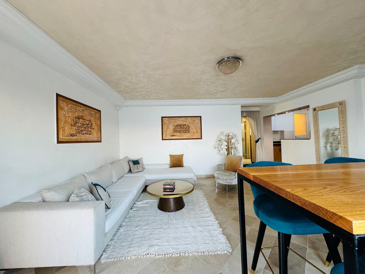 An interior that celebrates authenticity and allows you to have a unique living space An apartment decorated with handcrafted items that tell a story, each handcrafted piece contributes to the originality of our space. Apartment located in Les Jardins de Carthage, 15 minutes from the airport, 5 minutes from Lake 2 and the Carrefour La Marsa shopping mall, close to all amenities, La Marsa, Carthage, La Goulette Apartment has a parking space in the basement, fiber optic, smart TV, a desk area