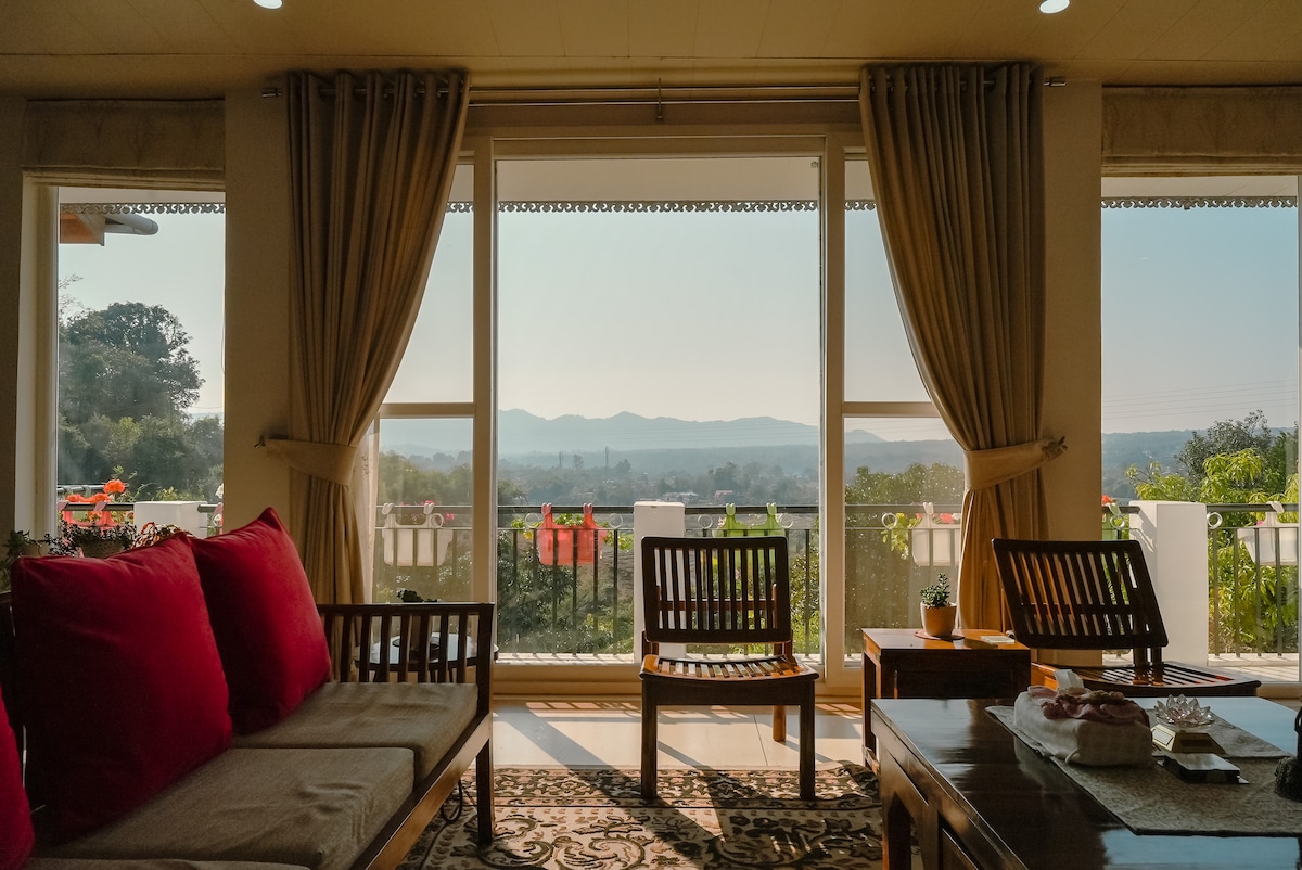 True Tranquility! The Cottage is a serene and peaceful retreat, overlooking wide pasture of land. The house is designed with huge glass glazing to get full view of the valley. The traditional wooden ceilings keep the room cool in summer and warm in winter. The cottage has two floors. The listed bedroom is situated on the first floor having independent entry from outside. There is a beautiful open terrace looking out over valley.