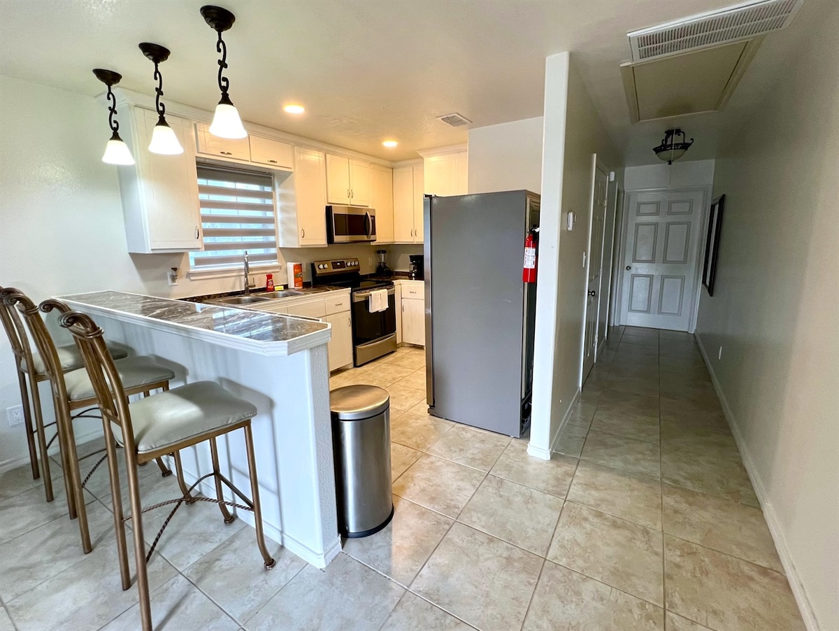 Soak up the vintage charm of this fully renovated Duplex apartment, reclaimed old wood floors, kitchen, fridge, stove/range, microwave, 2 large smart tv, living room, queen bed , modern bathroom with vessel sink limestone vanity top, private patio and yard, mature mesquite trees, dining table, table desk, a block away from Business 77, restaurants, stores, parks, walking and biking trails and the Ramsey park bird center, close to Valley Baptist Hospital and UTRGV Harlingen Campus.