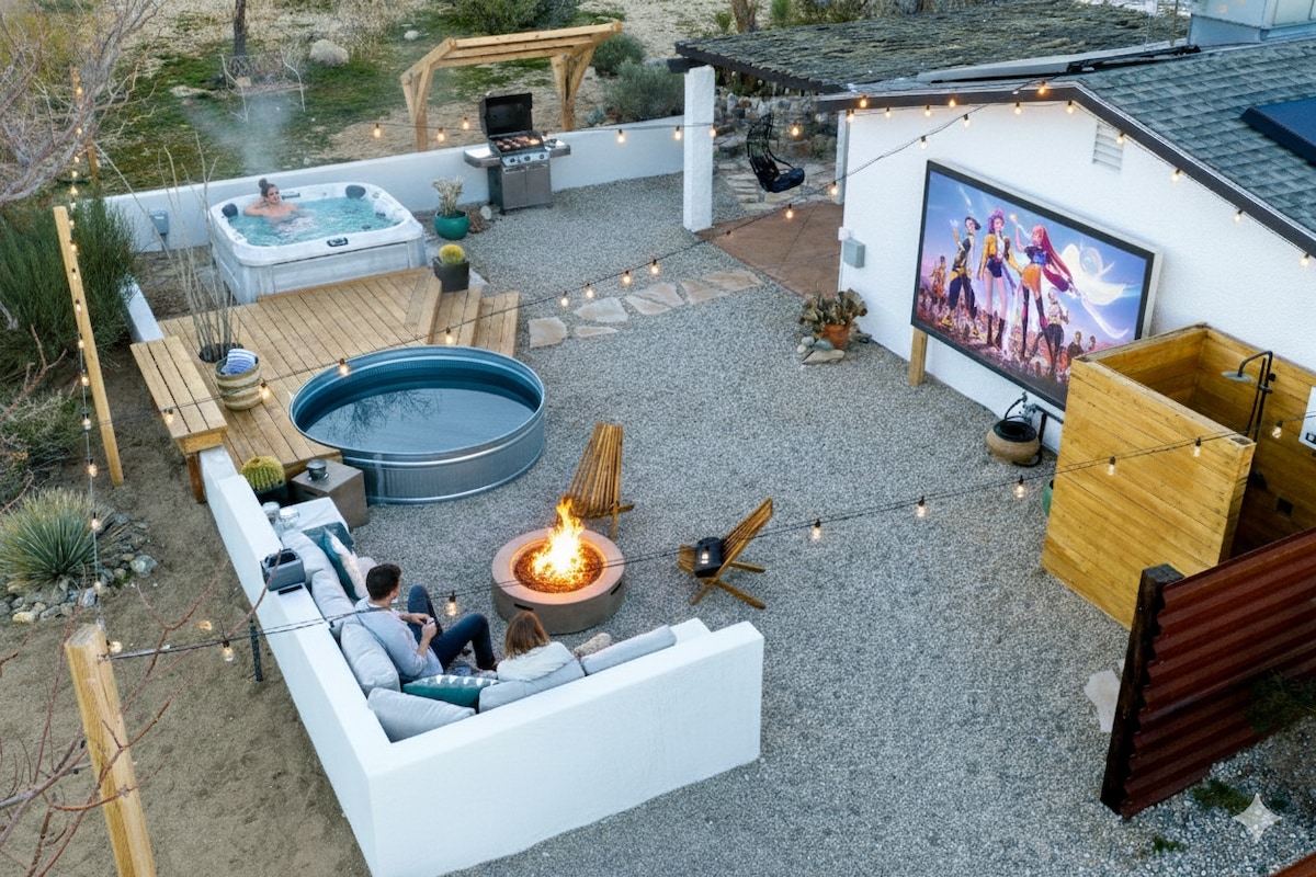 Gaze at a captivating watercolor sunset from the hot tub as the twilight sky brightens with stars. Decorated with comfort in mind, this cozy desert style boho modern-rustic home treats guests to a 10ft cowboy pool, a fun outdoor cold plunge bathtub, hot tub with a deck lounge chairs, fire pit, BBQ grill, stargazing mirror dome and telescope, 2 electric bikes and spectacular unobstructed desert views for acres. Near Joshua Tree National Park, Pappy and Harriet’s & other attractions. @casacabin