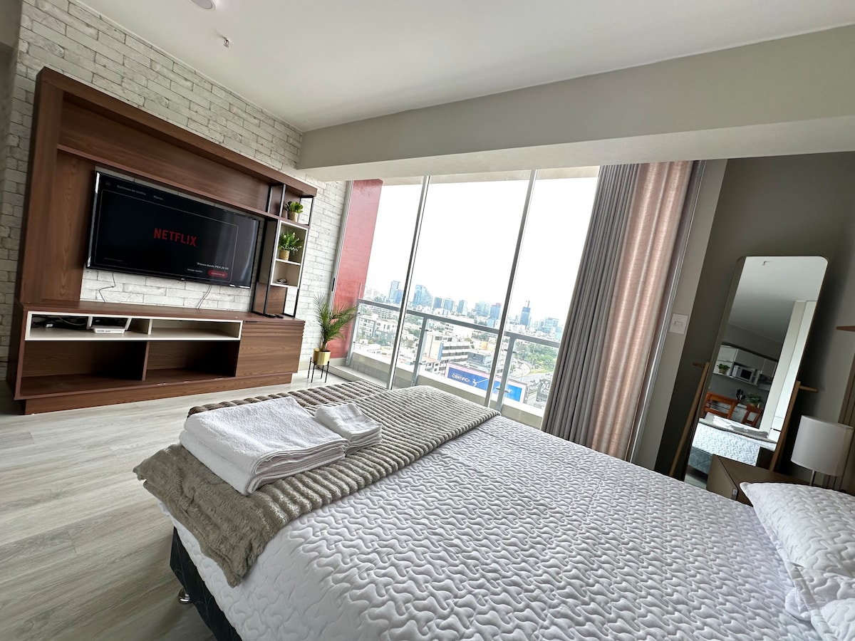 Brand new modern loft, very well located and with incredible panoramic view from the 35th floor. Easy access to main avenues, shopping centers, museum, train, financial center, clinics, gyms, parks. It has a laundry room, master bathroom, kitchenette, equipped kitchen, walk-in closet, hot water, TV, and Wi-Fi. Common areas: city viewpoint, rooftop, co-working. Close to tourist districts such as Miraflores, Barranco and Lima's Historic Center.