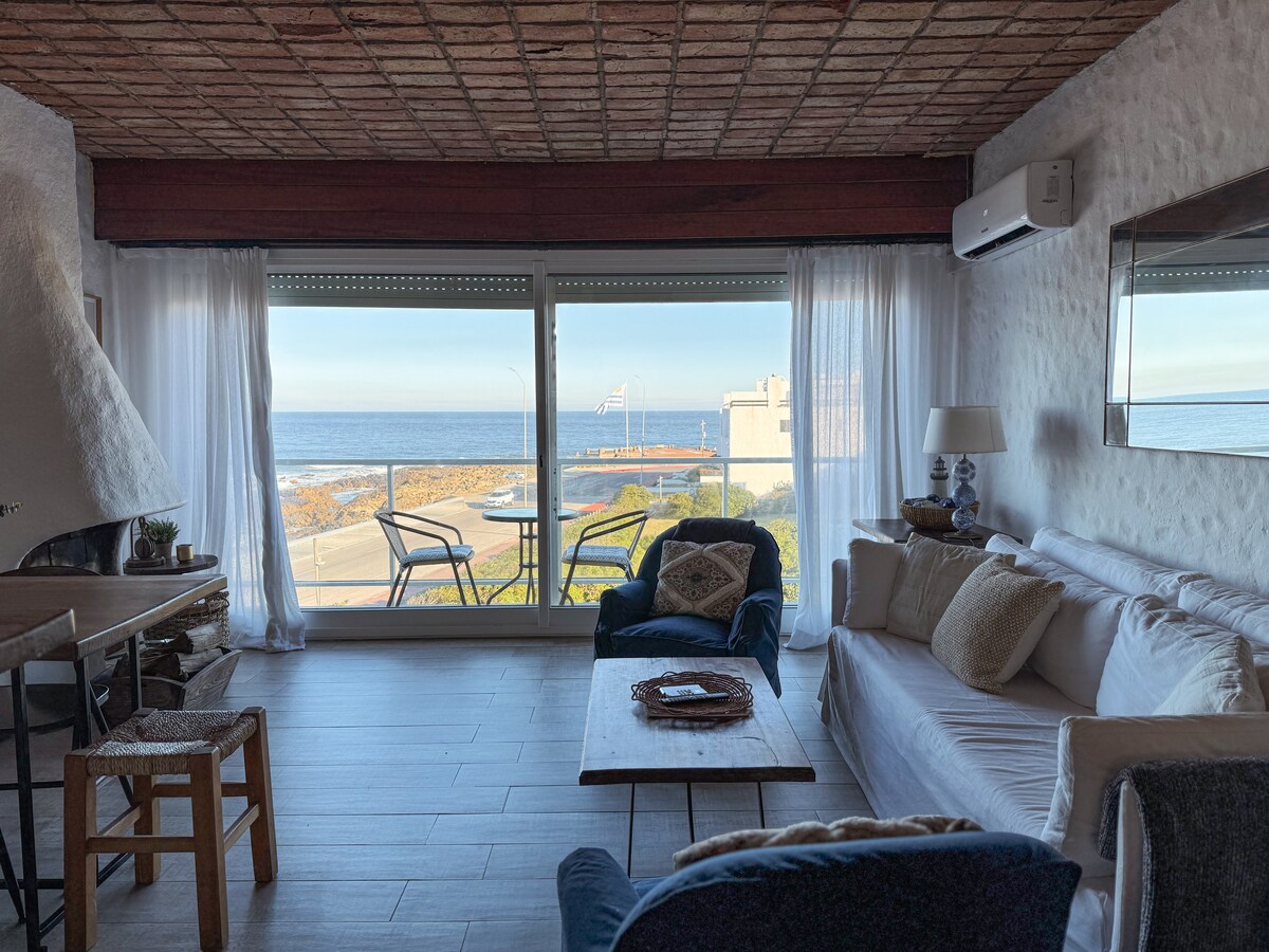 Spectacular apartment in Punta Ballena on the seafront. Next to Casa Pueblo, house and museum of the artist Carlos Páez Vilaró. It has 2 en-suite bedrooms, an integrated kitchen and dining room, a living room and a large terrace. Air conditioning and automatic blinds. Sheets, towels, beach chairs, and umbrella included. Optional maid service at an extra cost. Optional bicycles at an additional cost.