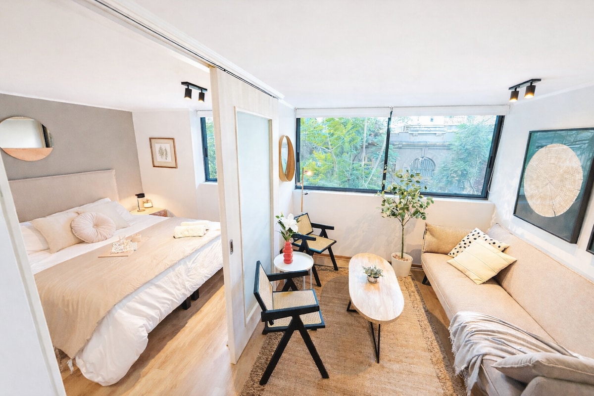 Una Suite patrimonial que combina historia y modernidad. Destaca por techos altos, ventanales franceses y chimenea ornamental original. Su diseño une encanto clásico con estilo minimalista, creando un ambiente sofisticado y acogedor en pleno barrio París-Londres. Equipada con cama King, sofá de diseño, comedor, cocina completa, aire acondicionado, Wi-Fi de alta velocidad y baño privado. Con capacidad para 3 personas, es ideal para parejas o viajeros que valoran confort y estilo.
