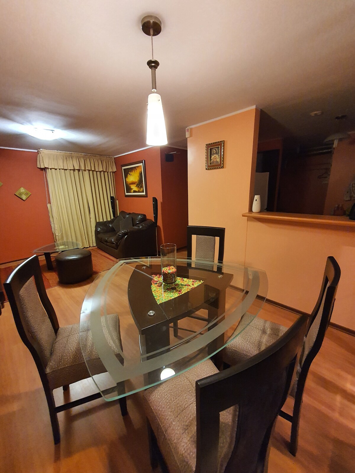 Relájate en pareja, disfruta en familia o con amigos, en este alojamiento donde la tranquilidad se respira. Rodeado de parques, con muy buena iluminación natural. Asegura tus vuelos en este Dpto completo que te permitirá llegar siempre a tiempo, ubicado a solo 15 minutos del Aeropuerto. Baño principal con Tina, agua caliente, tv 60' con Claro TV en la sala. El estacionamiento tiene una capacidad máxima hasta una Camioneta Kia Sportage. El Control Remoto tiene un valor de $80 dólares (cuidarlo)