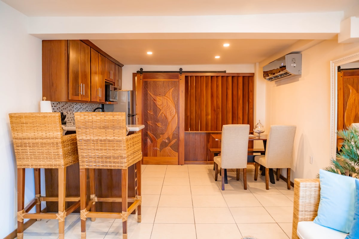 Chic Top-Floor Living with Ocean Views This second-story 1BR villa blends island style with stunning sea views. Enjoy your morning coffee from a private balcony overlooking the reef, or dine indoors in a breezy open layout. Ideal for a romantic getaway or solo trip. Modern appliances, fast WiFi, and soft linens offer total comfort—with eco perks included.