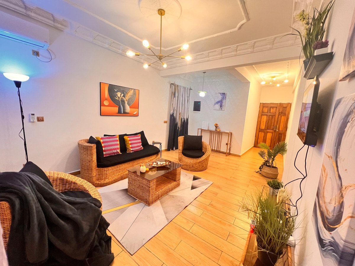 "Chez Ébène – elegant and spacious apartment in Bonanjo, Douala. Inspired by South Africa and Cameroon, this apartment combines the elegance of black with touches of African art. Cozy bedroom, bright living room, equipped kitchen. Quiet neighborhood, close to amenities. Ideal for couples or professionals. Book your haven of peace and enjoy a stay in a unique setting, where modernity and authenticity meet." Available: Netflix, Fiber Optic, Canal + and generator