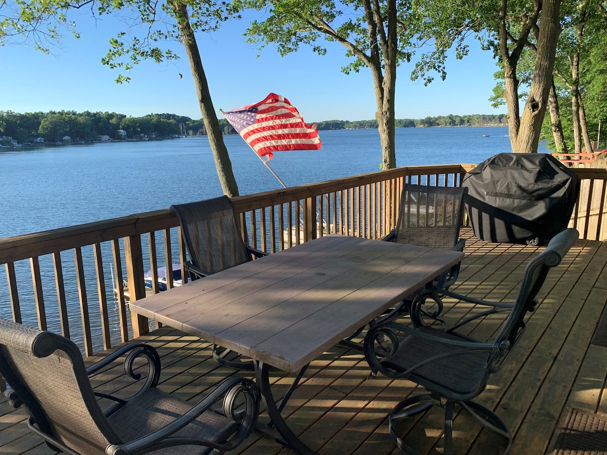 Nestled in a small cove on a large lake, this waterfront cottage has been completely renovated. It has 66' of private shoreline; an elevated front deck plus side patio; and stone bonfire pit & gas BBQ grill. Guests also get FREE & exclusive use of pontoon boat, 2 kayaks and paddle boat, plus private dock (early May through late October, weather permitting). Swan Cottage is very dog-welcoming. The yard is not fenced, however we provide ground stakes & cable ties.