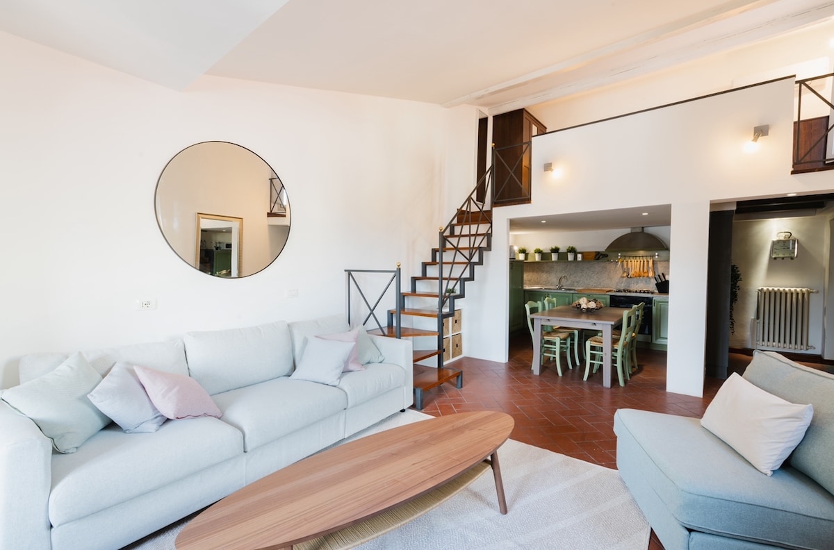 A cosy loft in the heart of Florence, just a few minutes from the Duomo. Exposed beams, warm light and a striking staircase that cuts through the space: an intimate setting, designed to help you unwind. Everything is within walking distance: museums, restaurants, shops. But when you return home, the city stays outside. Perfect for those who want to truly experience Florence, not just visit it.