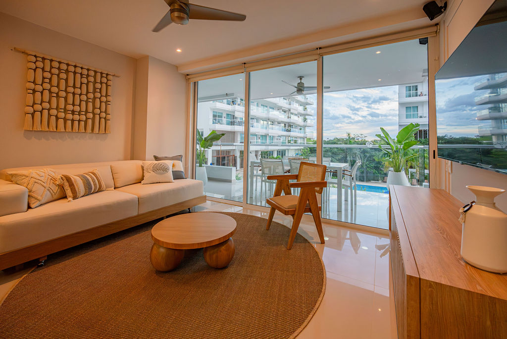 Playa Dormida Dos offers a private and semi-private beach, a beautiful pool overlooking the ocean, a luxurious hotel-style lobby, a snack and drink bar, a playroom for children and young people, a dry solarium, a parking lot for visitors, and access elevators. The apartment offers a full kitchen, air conditioning in all bedrooms and in the dining room, 4 bathrooms with shower, washer-dryer, dining room and double living room, second dining room and lounge furniture on the balcony and maid service.