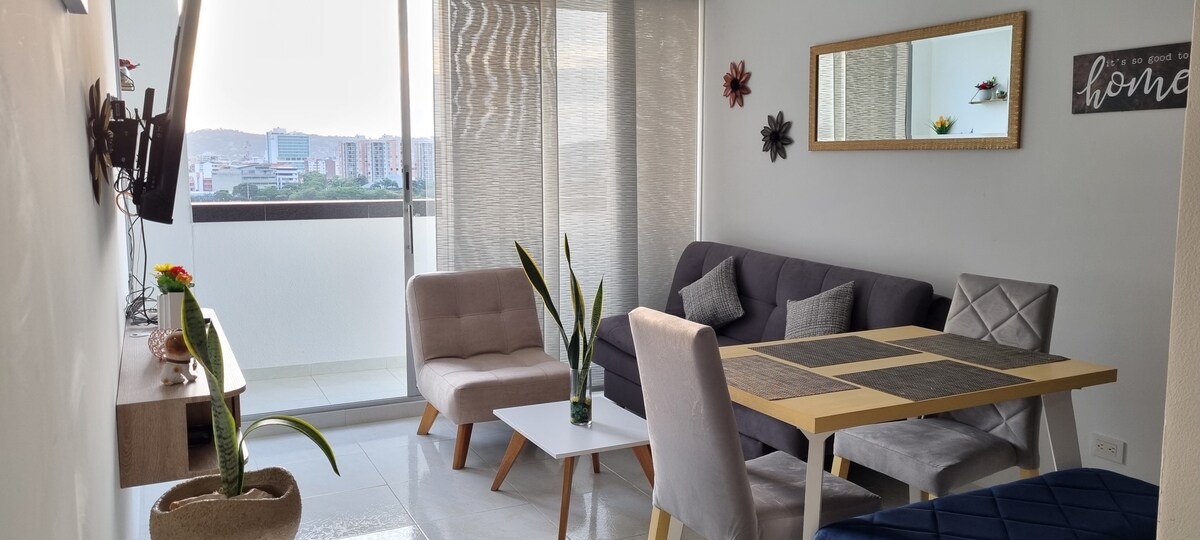 Enjoy a luxury experience in this beautiful apartment. Close to the metropolitan area's shopping centers, Neomundo and medical centers. It has a parking lot. New apartment with two bedrooms, two bathrooms, open kitchen and a comfortable living room. Here you can enjoy a great view of Bucaramanga and Floridablanca. The master bedroom has air conditioning, the bedrooms have Smart TVs. You can enjoy fiber optic internet access.