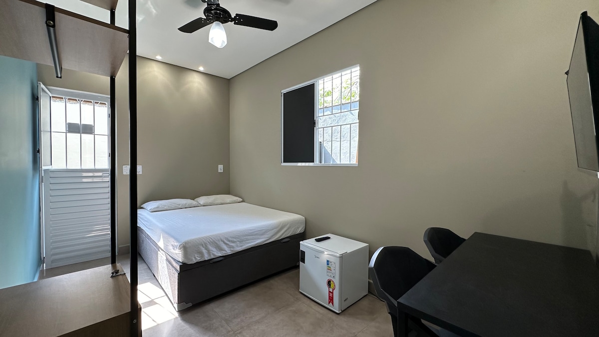 Suite with bunk bed, single bed and availability for a mattress on the floor. Good location, close to supermarkets, cafes and restaurants. 14-minute walk to Enseada Beach (900m). -For up to 4 guests (INDICATE THE QUANTITY ON THE RIGHT, AS THE PRICE VARIES) -Wi-Fi Internet; -Fan; -Bed sheets, pillows and towels (no change); -Kitchen available (refrigerator, stove, microwave, utensils and table); -Garage for motorcycles only; - Visitors, smoking and pets are prohibited.