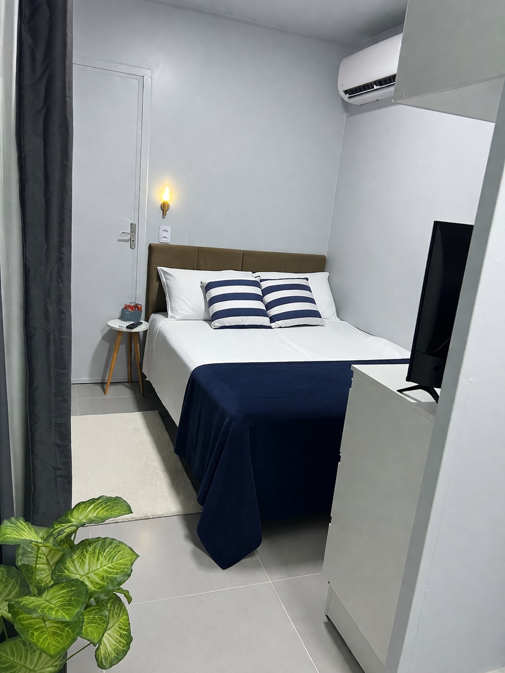Modern and well-equipped studio, ideal for comfort and convenience. Includes washer-dryer, air conditioning, Smart TV with Netflix and Prime Video, fully fitted kitchen and fast Wi-Fi — perfect for business trips or relaxing getaways. Excellent location in Estreito, just minutes from central Florianópolis, close to the hospital, Orlando Scarpelli Stadium and the waterfront promenade. Private parking included.