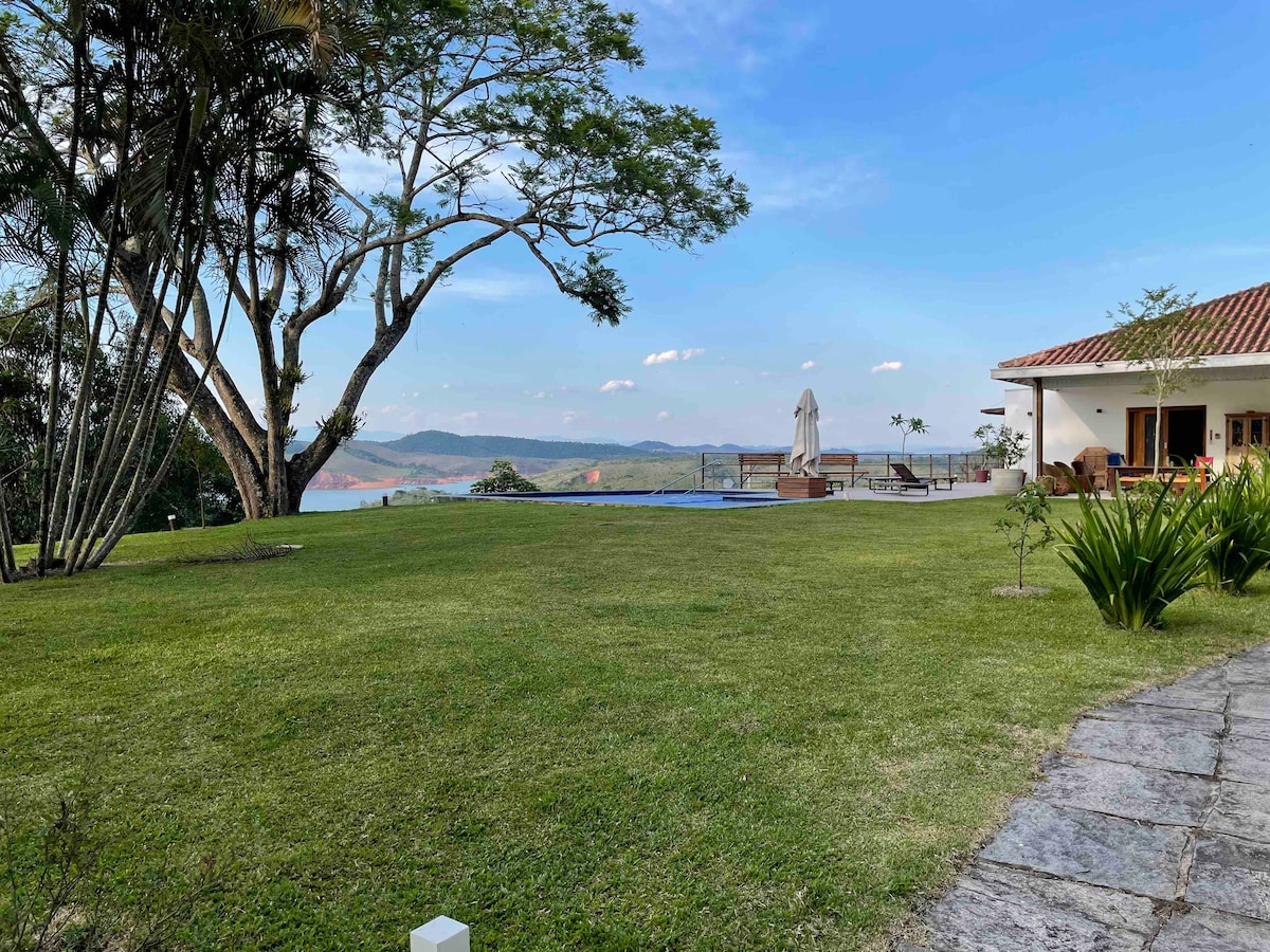 Perfect country house facing the dam. Ideal for those seeking peace and quiet with family and friends (Maximum capacity 9 people). House with 3 bedrooms (all with air conditioning) and two bathrooms (internal and external), smart TV, barbecue, wood oven, full kitchen, WIFI. Swimming pool with hydro, playground. We have a floating deck and access ramp to the dam, bring your boat, jet ski or kayak. We are pet friendly Easy access by the Tamoios highway, near the Rosa Mística church.