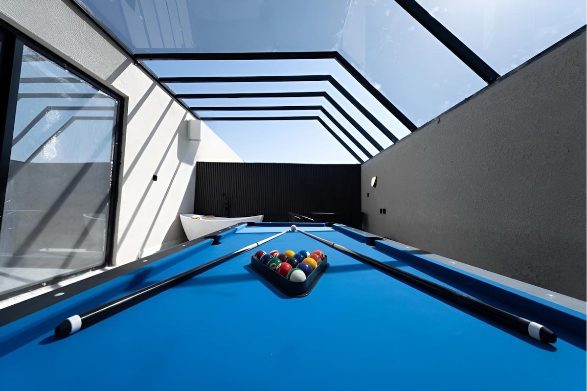 Spacious full-floor apartment in vibrant Tahlia area. Features a living room, dining space, full kitchen plus kitchenette for added convenience. Includes 1 master bedroom with king bed and walk-in closet, and a cozy second bedroom with a queen bed. Step onto the huge rooftop overlooking Tahlia Street complete with a jacuzzi, fireplace, BBQ grill, and outdoor seating. Ideal for gatherings, relaxation, or long stays in style.