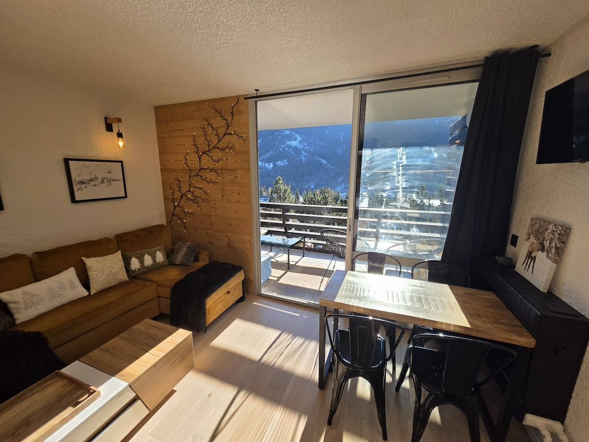 Magnificent studio ideally placed to take full advantage of the Serre Chevalier valley ! Equipped with a small sunny and furnished terrace in summer and winter to enjoy the panoramic view of the mountain or the fireworks. A new bed - sofa is installed since october 2024. Ideal for couples, groups of friends or families You will have a shared garden, a car park and a ski room. Professional cleaning and disinfection before your arrival, sheets and towels are not provided.