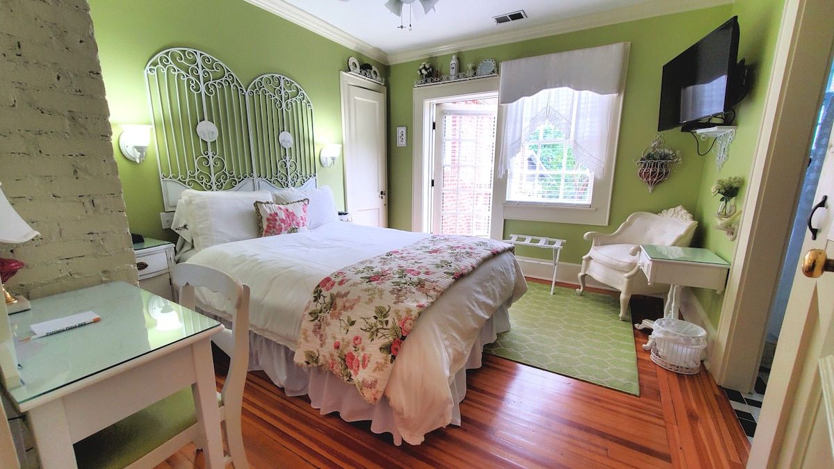 6 years as AirBnB SuperHosts! Bring Romance or work.. escape to Savannah at your doorstep, with a gorgeous beach 25 minutes away. Private bathroom, fridge, coffeemaker and large Smart TV. We're close to some of Savannah's finest restaurants and bars. 4 minute walk to Foxy Loxy cafe (amazing place) and 12 minute walk to Forsyth Park. One note: the suite is on the second floor with a staircase. Central filtered Air and Heating. Not suitable for pets or young children. Private, with key.