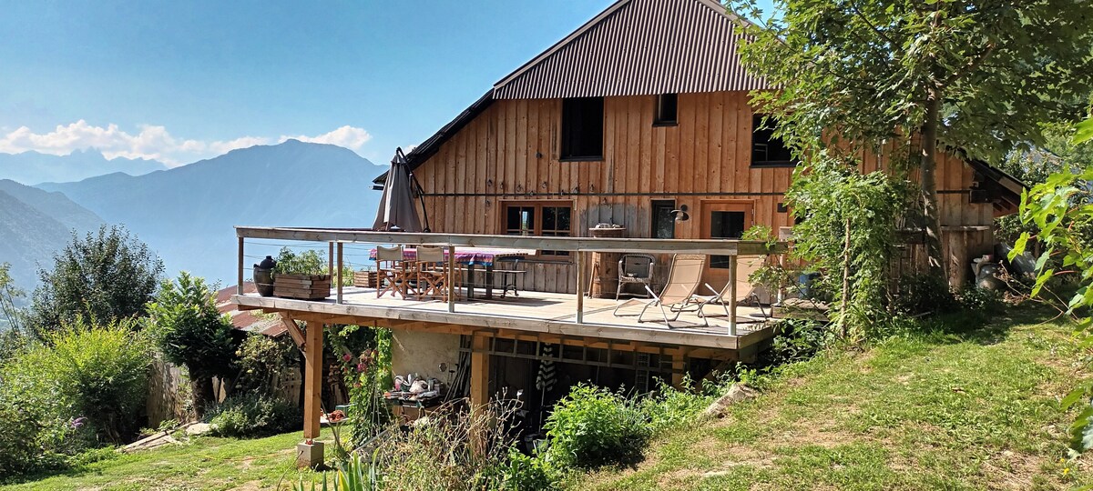 In privileged surroundings encircled by mountains, ski stations and cycling summits at the foot of the chaine of the Belledonne mountains. The very comfortable renovated haybarn has exposed beams, view of roof structure through glass ceiling, stone walls and wooden floors but with a modern contempary touch. A deck to sit, listen and admire the breathtaking countryside, it's wildlife (Refuge ASPAS) and the horses who live on the farm, whilst savouring the pure tranquility .. and a glass of wine!