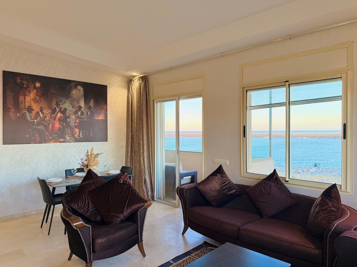 Goûtez l'élégance et détendez-vous dans ce logement calme , propre , très bien équipé, avec deux balcons offrant une vue panoramique sur la mer. Composé de deux chambres à coucher luxieux, ayant un grand lit king size, et un canapé lit. Le salon dispose d'un canapé large de 85mm avec des pouffes et une table élegante. Une cuisine totalement équipée et une salle de bain à l'américaine. l'Appartement au bord de la plage dispose de la climatisation. Située à Mehdiya, à quelques pas de la plage.
