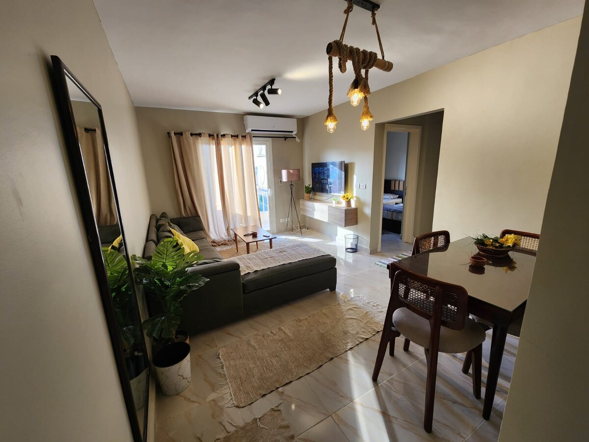 The spacious apartment features 2 bedrooms with Master bedroom , 2 bathrooms, bed linen, towels, 2 Smart TV with streaming services, a dining area, a fully equipped kitchen, and a terrace with garden views. Self Check in With Smart Lock. 📍 Wifi&Parking available Near 2 of the most famous supermarkets ‘ Seodi and Mahmoud el Far’ and Coffee shops As a dedicated host, I ensure to provide you with the comfiest and best quality. with high grade cleaning, you’ll feel right at home.