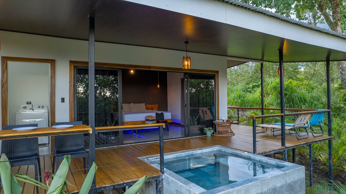 Un hospedaje para escapar de la rutina y conectar con la naturaleza, tiene un diseño moderno con una cálida decoración, rodeado de naturaleza donde podrás observar muchas aves, una linda vista al volcán, balcón, terraza, una refrescante piscina y jacuzzi privado. Un lugar ideal para parejas, amigos o para que puedas teletrabajar tranquilamente. Ubicados estratégicamente cerca de todas las actividades principales y a tan solo 2.5 km del centro de La Fortuna y a 1 km de La catarata La Fortuna.